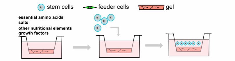 الآن جاء دور التدعيم الثاني للخلايا الجذعية، وهي زراعة طبقة من الخلايا الداعمة تسمى Feeder Cells, وظيفتها تدعيم الإلتصاق وتزويد الخلايا التي تزرع فوقها بمواد تفرز في الطبق للمحافظة على عدم الانقسام وتدعيم الإلتصاق والإستمرار في التزايد العددي.