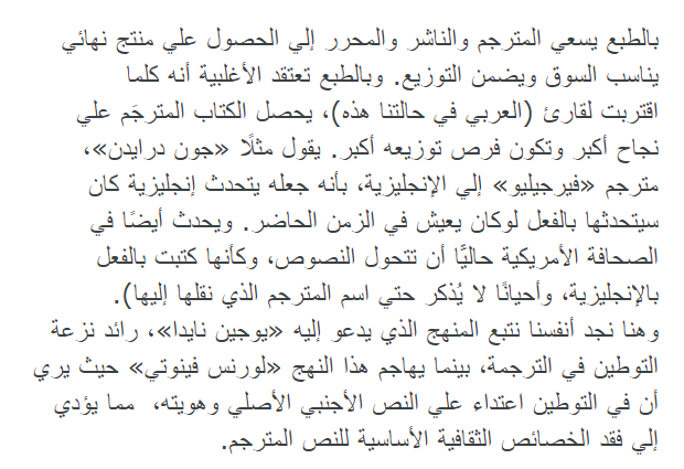 الترجمة ليست فقط مواجهةً بين مترجم ونصٍ أصلي، فالأطراف المشاركة في عمليات انتاج الترجمة وتلقيها كثيرة ومتعددة، ويلعب كل منها دوراً في تشكيل الترجمة وتحديد سماتها ومعاييرها، ومسارها ومصيرها داخل الثقافة المنقول إليها. (سامح حنا- من المقال السابق) @SamehHanna4