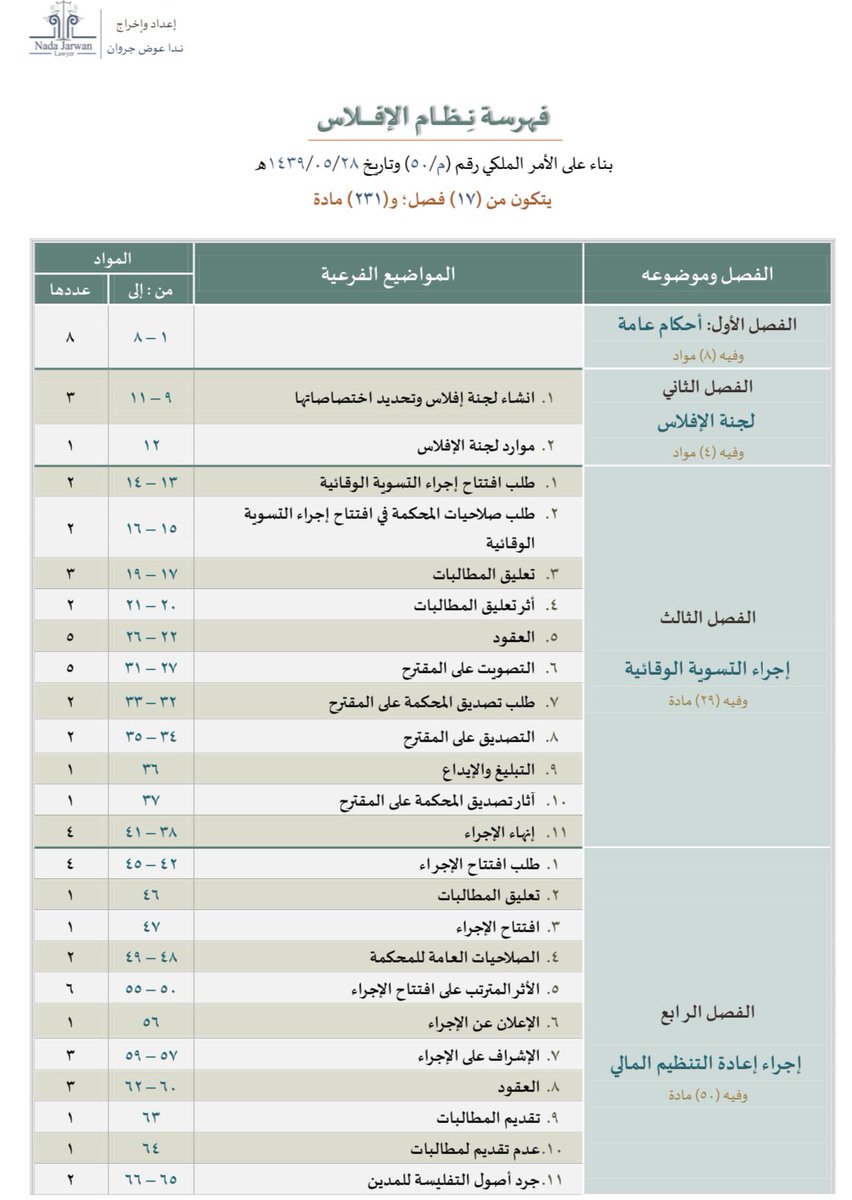 ٣- نظام الإفلاس الجديد (١٤٣٩) في (٢٣١) مادة. وقد ألغى التنظيمين السابقين.