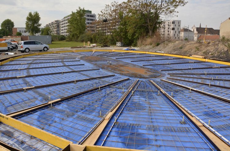 ١- يتم وضع شبكة التسليح على سطح الأرض ويكون تحتها بالون مفرغ من الهواء، وتُصب الخلطة حتى تتصلب.