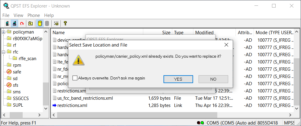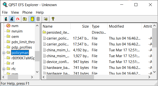 بعد التثبيت يتم توصيل الهاتف بالكمبيوتر و فتح برنامج QPST وسوف ترا هاتفك ومن القائمة أعلى اضغط start clients ثم EFS Explorer ثم OK وتنتظر قليلا سوف تظهر لك قائمة ابحث عن ملف policyman .