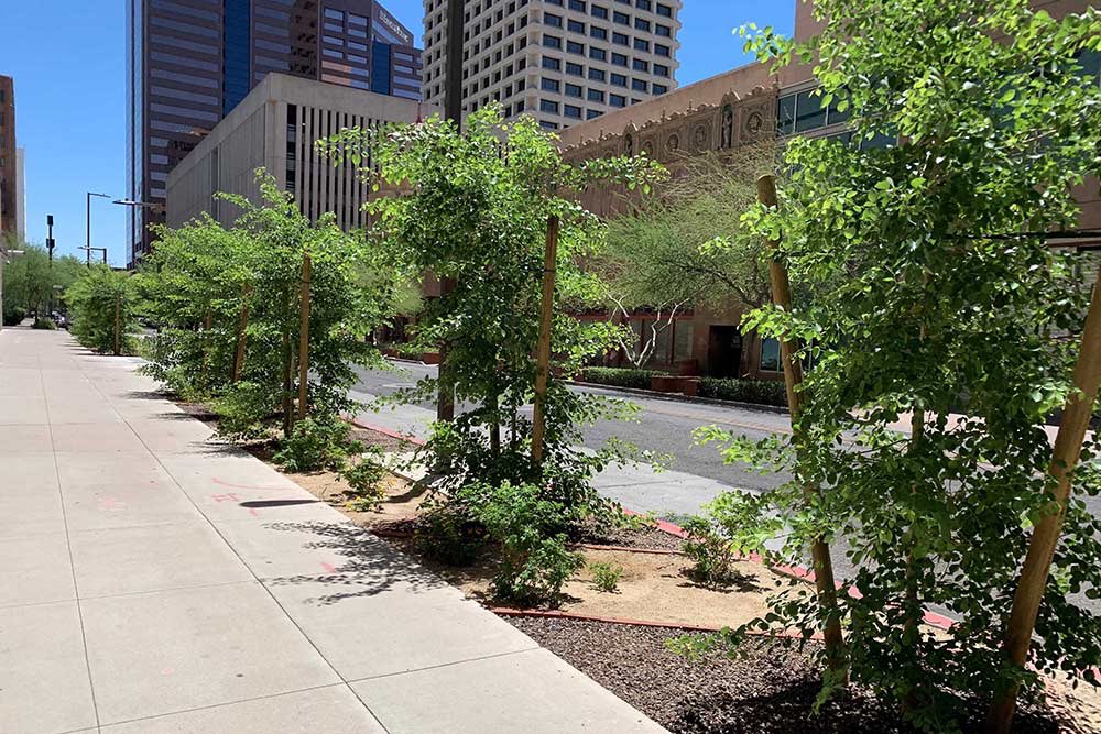 فينيكس مدينة امريكية صحراوية تعاني الجفاف من عدة عقود، حيث تبلغ متوسط ​​درجة الحرارة حوالي 50 مْ ويوثر ذلك على زيادة استهلاك الطاقة والمياه مما يؤدي إلى زيادة التكاليف والموارد، ولكن هناك حل واحد وهو (الأشجار)