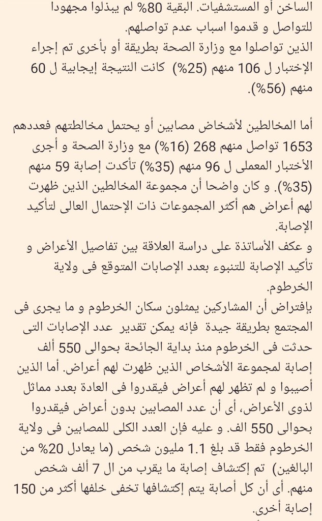 🔴دراسة خطيرة كشف عنها البروفسور شريف بابكر الأستاذ بجامعة الخرطوم، حيث نشر نتيجة دراسة لإستبيان للمصابين ب #كورونا فى الخرطوم و الجزيرة و الولايات، تؤكد أن عدد المصابين الفعلى هو 1.1 مليون مصاب فى ولاية الخرطوم (20% من البالغين)، المكتشف فعليا منهم 7 ألف حالة فقط. #السودان