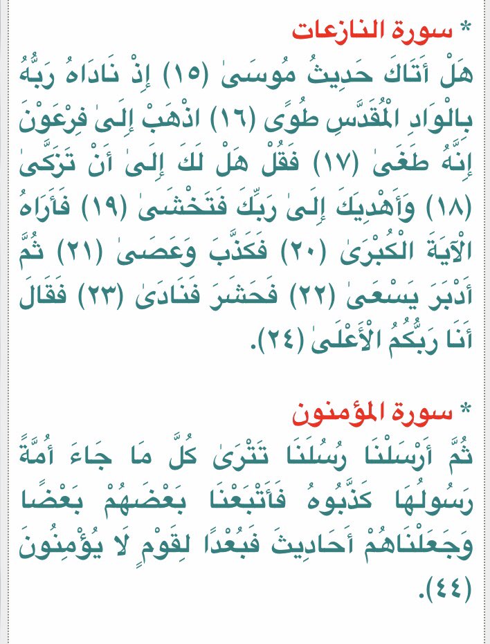 وَقَالَ الَّذِينَ كَفَرُوا لِلَّذِينَ آمَنُوا اتَّبِعُوا سَبِيلَنَا وَلْنَحْمِلْ خَطَايَاكُمْ وَمَا هُمْ بِحَامِلِينَ مِنْ خَطَايَاهُمْ مِنْ شَيْءٍ إِنَّهُمْ لَكَاذِبُونَ" = آية (٩٦) من سورة طه: "قَالَ بَصُرْتُ بِمَا لَمْ يَبْصُرُوا بِهِ فَقَبَضْتُ قَبْضَةً مِنْ أَثَرِ الرَّسُول