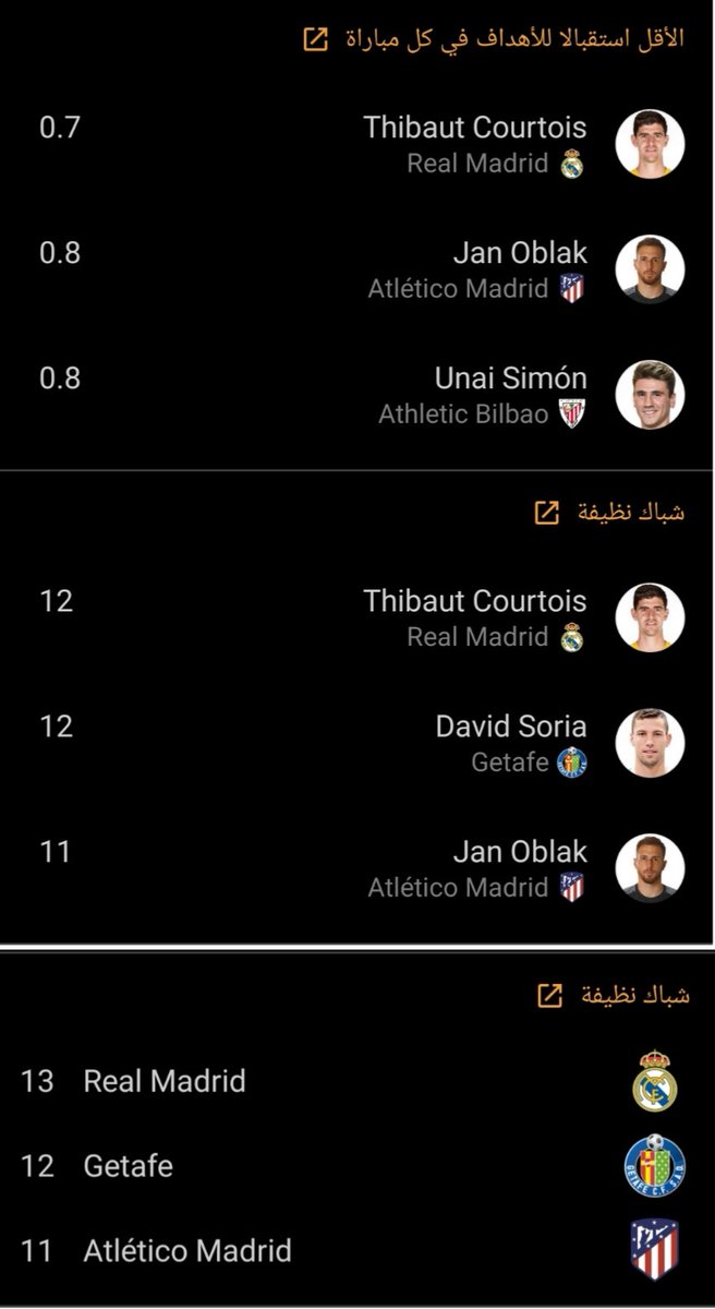• الريال افضل دفاع بالليغا برصيد 19 هدف، منها 13 كلين شيت. كورتوا هو الحارس الأقل تلقي للاهداف( 0،70 هدف/مباراة)