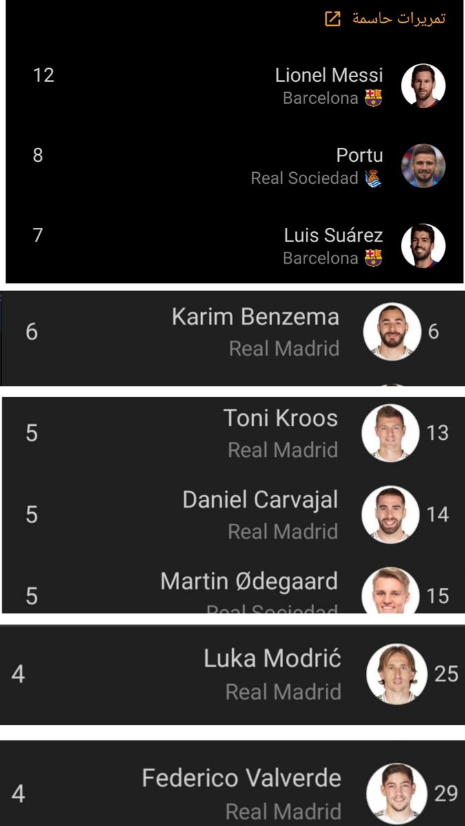 أول مدريدي في المرتبة 6 هو بنزيما. كروس و كارفاخال بالمركزين 13 و14 برصيد 5 تمريرات لكل منهما،مودريتش يقبع بالمركز 25 ب4 تمريرات، يتبعه فالفيردي بالمرتبة29!