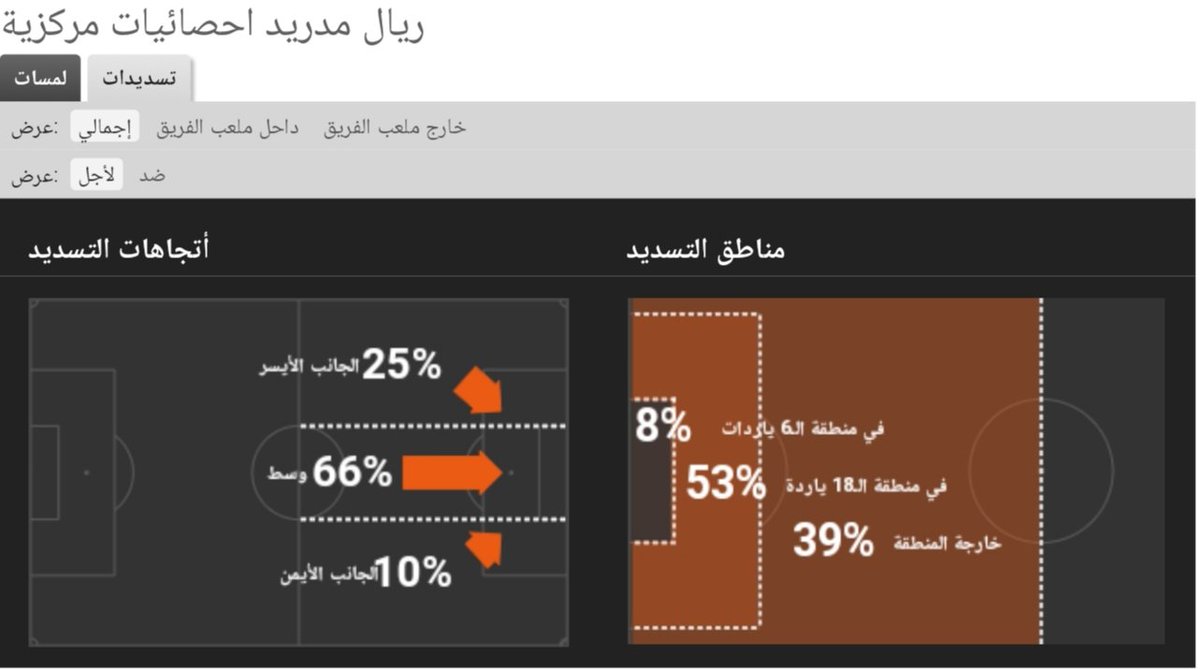 بالتوزيع العرضي نجد أن اللعب الهجومي للريال تركز بشكل لافت في الجهة اليسرى، أقل في الجانب الأيمن و اللجوء لعمق الملعب ك حل هجومي أخير.