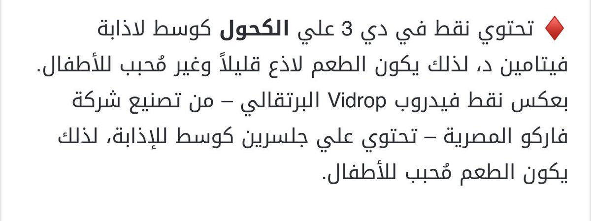 ⬅️#فيدروب (VIDROP)وهو منتج مصري يحتوي على١٥مل وتركيز فيتامين دال في العبوة الواحدة تعادل ٤٢٠٠٠ الف وحدة لا يحتوي على كحول