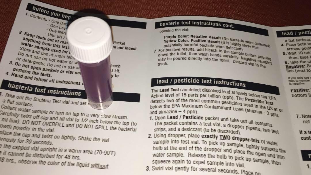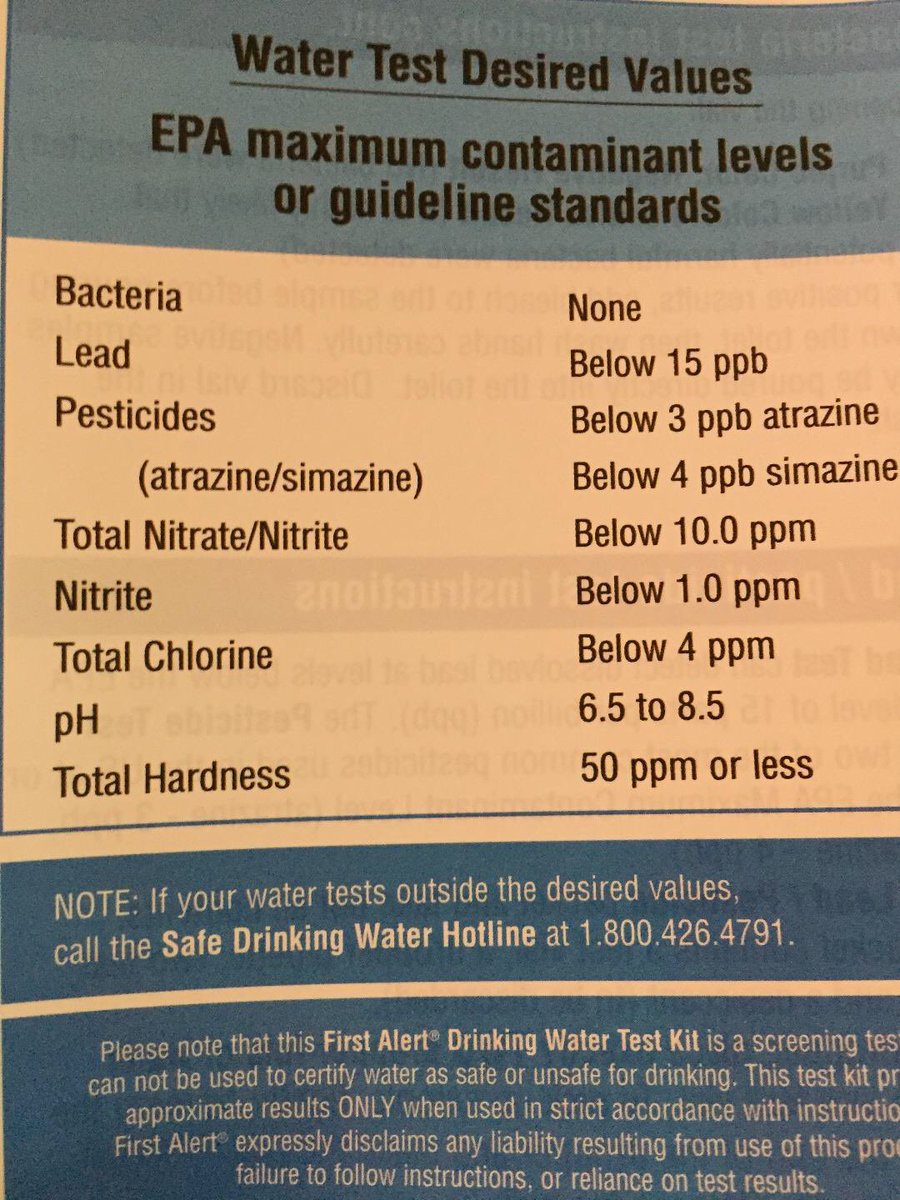 عدة الفحص كانت صناعة امريكية من انتاج First Alert تم شراؤها عبر امازون، والفحص المختص بيتكون من ٧ فحوصات تضم فحص بكتريا ال E-coli، نسبة الرصاص، وجود مبيدات زراعية، املاح النترات، مادة الكلورين، درجة عسر الماء water hardness، و فحص الأس الهيدروجيني PH (القلوية/الحموضة) (٢)