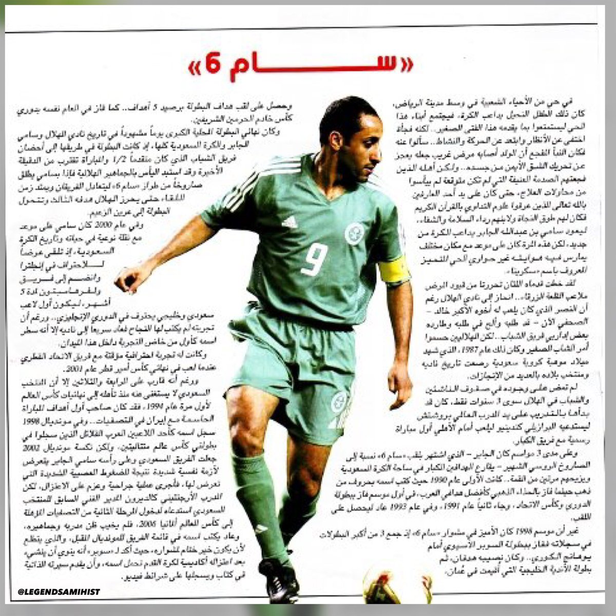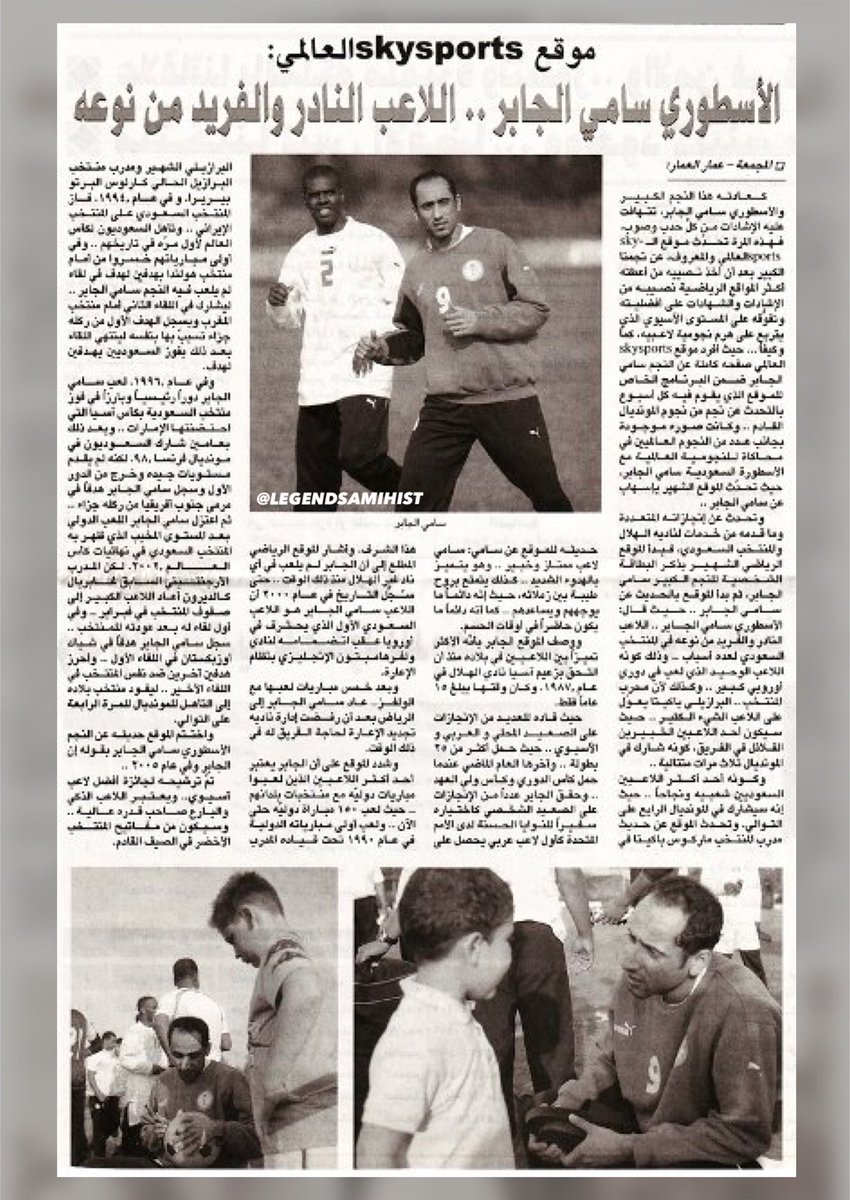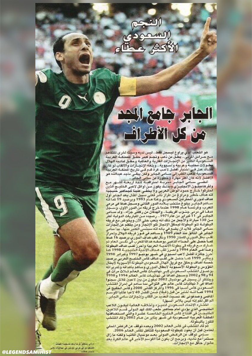 • تقرير لـ #FIFA | #سامي_الجابر " خامس لاعب في تاريخ نهائيات كأس العالم" يسجل في مونديالين يفصل بينهما (12) عام .. بعد مارادونا وبيليه .. والأسطوره @SamiAlJaber يوضح بأنه فخور أن ينهي مسيرته .. ويرتبط أسمه مع عمالقة كرة القدم @Pele و #Maradona ..