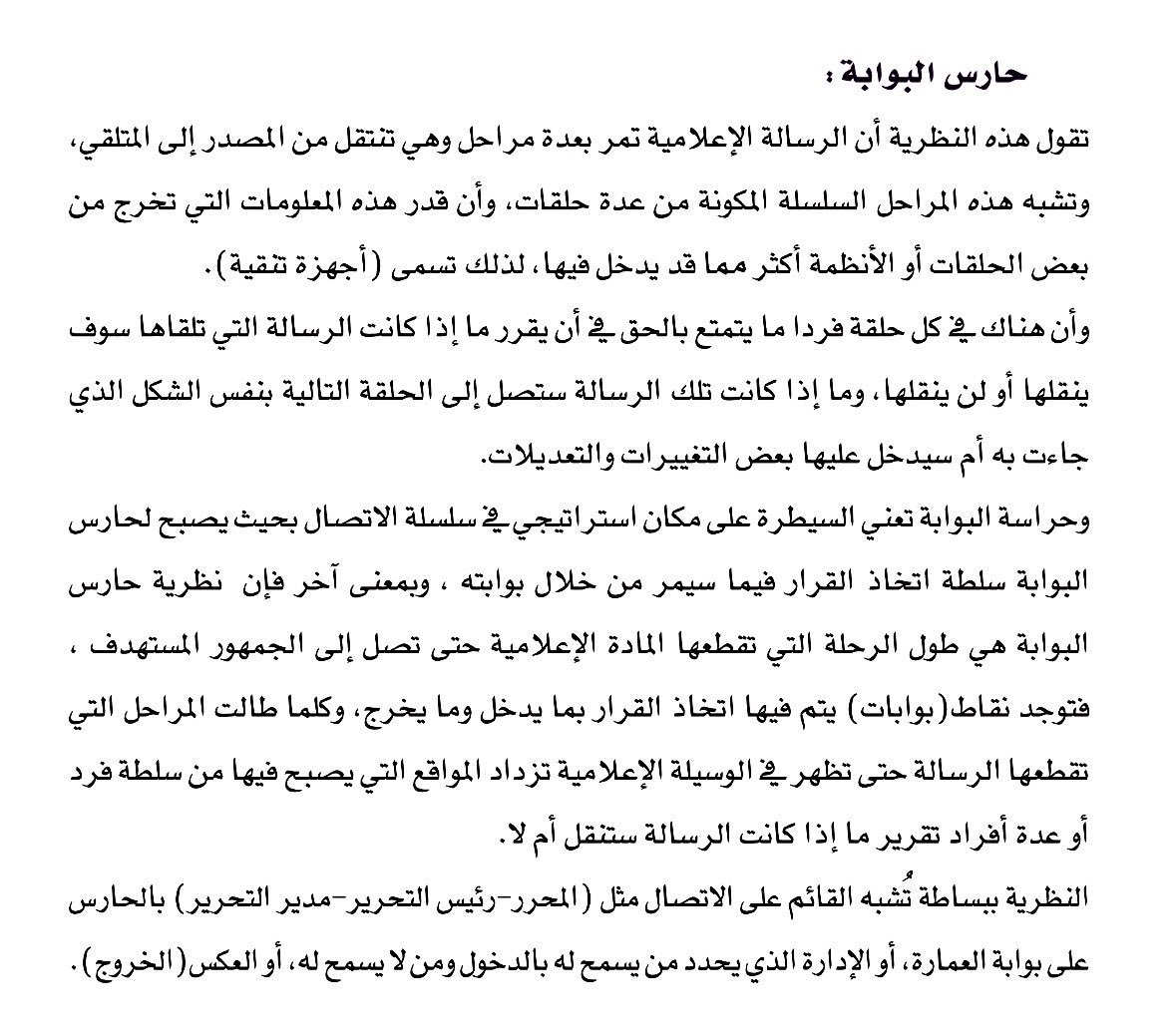 النظرية ببساطة تُشَبه القائم بعملية الاتصال مع الجمهور ( المحرر ، مدير التحرير ، رئيس التحرير ... الخ ) بحارس المبنى الذي لديه سلطة السماح لمن يشاء أن يمر ، ومنع من يشاء من المرور .