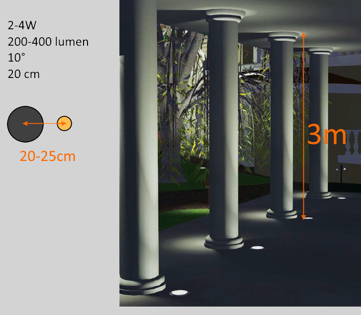 لانارة عمود بارتفاعد 3 متر من الارضية يمكن استخدام كشاف ارضي باستطاعة 2-4 وات وزاوية ضوء 10° كما هو موضع