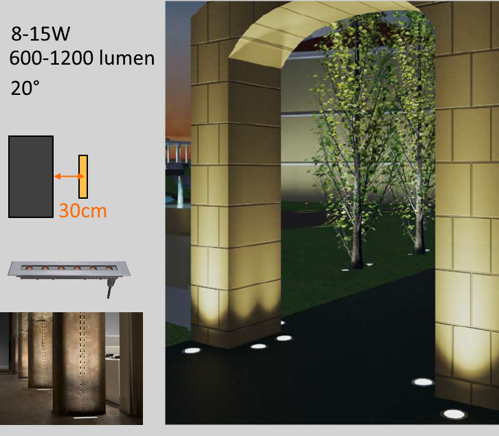 الاعمدة المربعة والمستطية يمكن استخدام كشاف خطي يسمى inground wall grazer