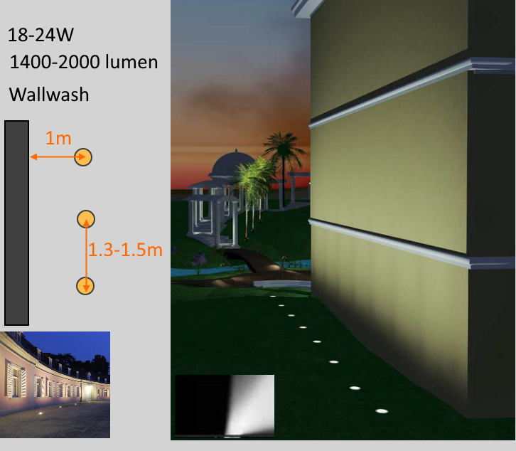 يمكن استخدام كشافات ارضية لها زاوية ضوء 45° بعيدة 70 سم عن الجدار وبتباعد 1.5 م بينها