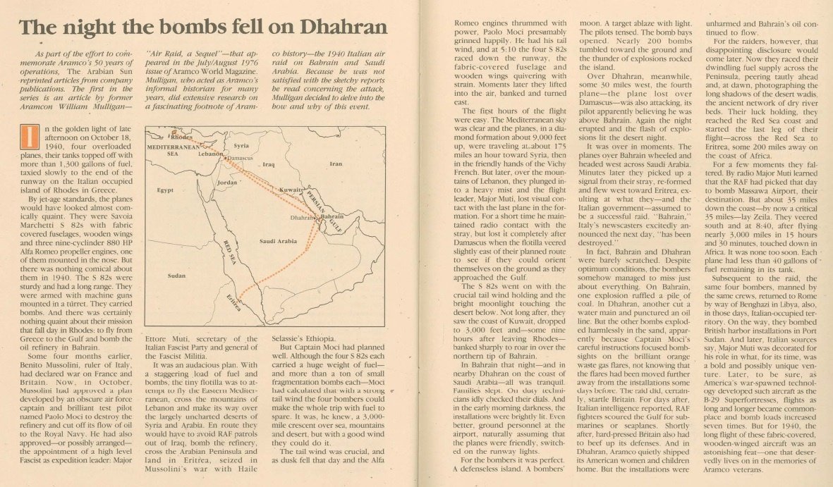 في فجر يوم 19 أكتوبر 1940م، أثناء الحرب العالمية الثانية، سُمع في مدينة الظهران انفجار قوي أثار الرعب عند الجميع، بعد غارة جوية شنتها طائرة حربية إيطالية ألقت خلالها قنابل.
