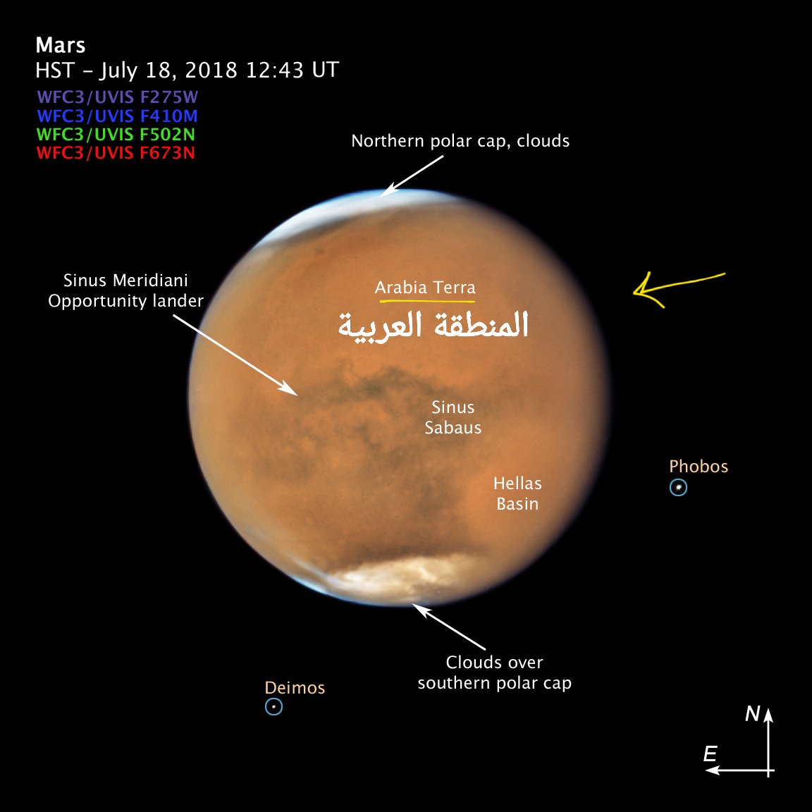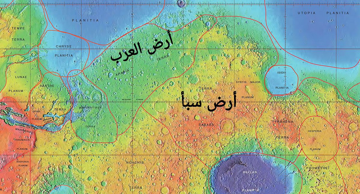 نقلنا لكم قبل يومين عن أسماء فوهات القمر العربية ، واليوم سنذكر لكم أسفل هذه التغريدة أسماء المناطق العربية التي سُجلت رسميًا في #كوكب_المريخ 🌍🧡