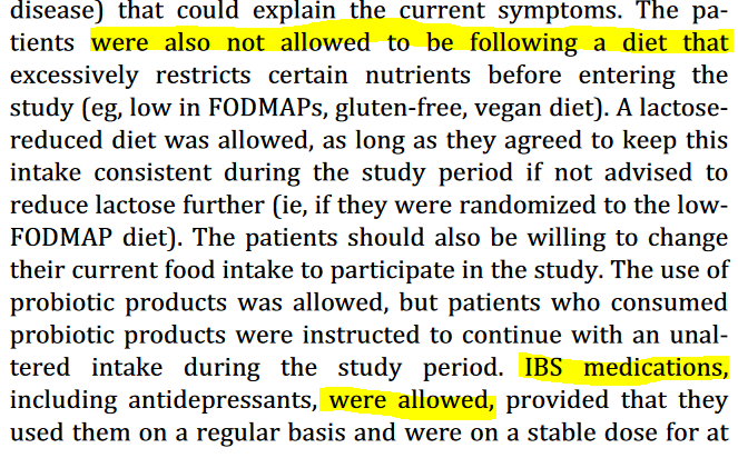 أيضاً ننظر هنا الى عامل آخر، وهو بأن مرضى اضطراب القولون العصبي المشاركين في الدراسة كانو يتناولون بعض الادوية، والبروبايوتك، وكان لديهم شروط قبل البدء بالدراسة... #دايتشن_يفكر هل يمكنك التفكير في سؤال نقدي لهذا البروتوكول المتبع في الدراسة؟
