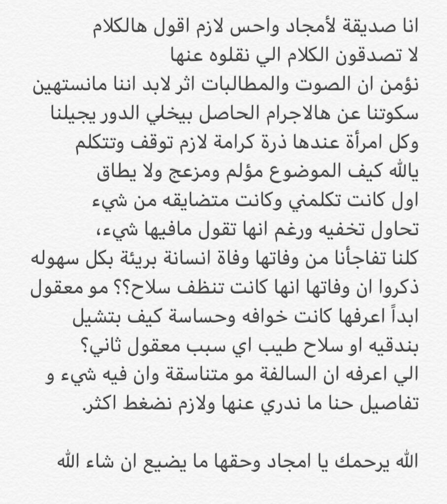 ( صديقاتها وقبيلتها يقولون توفت وان الي يصير في هاشتاق #المغدوره_امجاد_محمد_الحرقان كله كذب ومستغربين )
