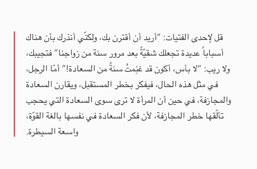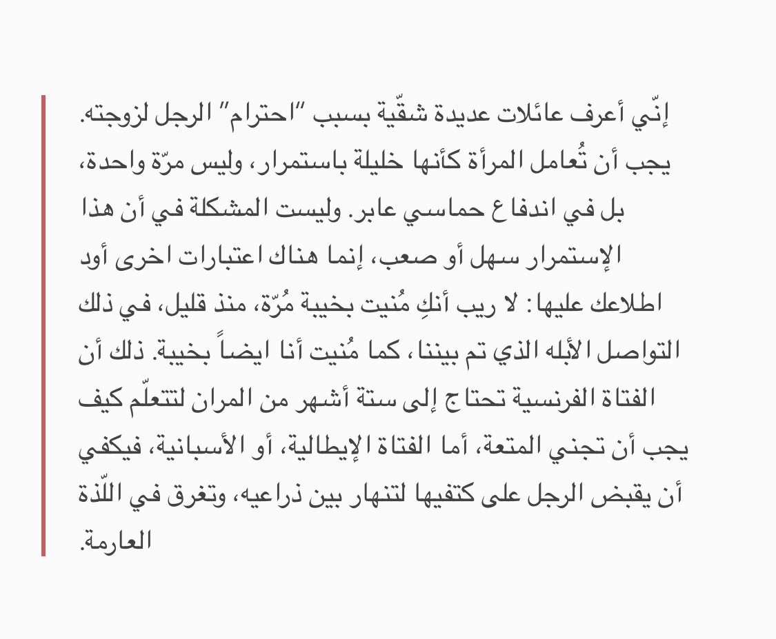 “في ذهني هذه الفكرة الراسخة أبدا، وهي أن حُب المرأة لا يمكن أن يكون ضرباً من التنازل لأنها هي المغلوبة دائماً في الوصال الجنسي”