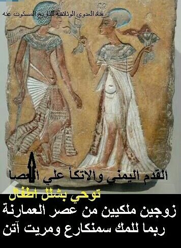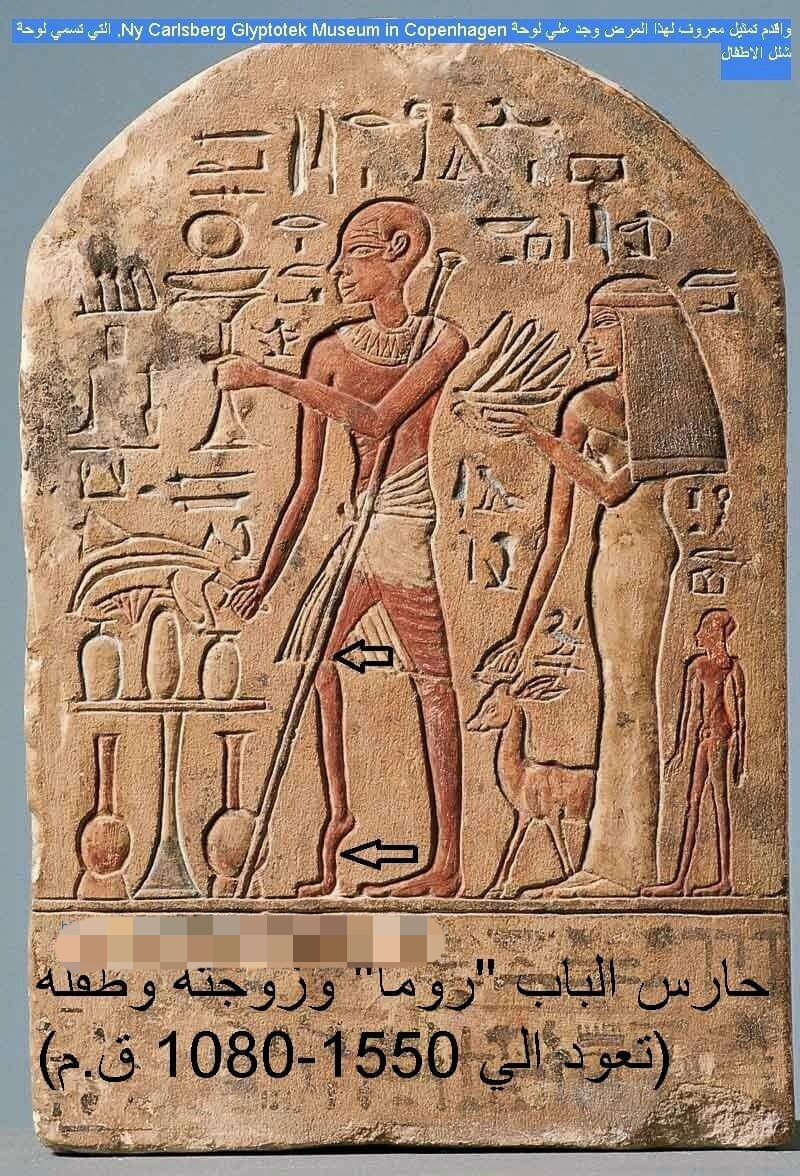 "مننا "بجبانة القرنة في منظر للحصاد رجل يعاني من ضمور في قدمه اليسري ويتكأ علي عصا طويلةكذلك توجد مصورة ربما تعود لعصر العمارنة لزوجين ملكيين ربما الملك "سمنكارع ومريت أتن" يلاحظ فيها أن الرجل يتكأ علي عصا طويلة وإن قدمه اليسري بها ضمور "شلل أطفال" 👇
