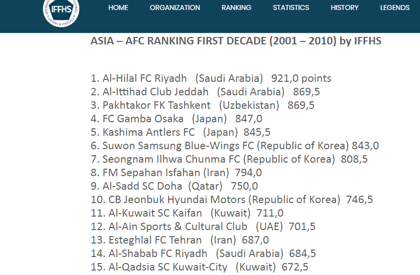 🔵🔵 احتل نادي #الهلال السعودي المركز الأول في تصنيف "IFFHS" موقع الاتحاد الدولي لتاريخ وإحصاءات كرة القدم، وذلك لأفضل الأندية خلال العقد الأول من القرن الحالي (2001 ـ 2010)، برصيد 921 نقطة، بعد أن تُوج الزعيم من قبل بلقب نادي القرن في آسيا.