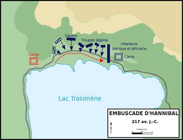 نشر حنبعل رُماته أعلى التلال و نشر الفرسان في قرب مدخل الممرات أما المشات فقد وضعهم في صفوف رأسية حتى يتمكنوا من القتال و إغلاق أي منذ لفرار الرومان ،في يوم المعركة بُعث بمجموعة لمنوشة جيش "فلامينيوس"بعيدًا ليزيد من ثقة الرومان و إكمال مسيرتهم نحو حتفهم