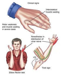 - الإحساس بالخدر والوخز والتنميل في أصبعي الخنصر والبنصر ويزيد مع الثني الطويل