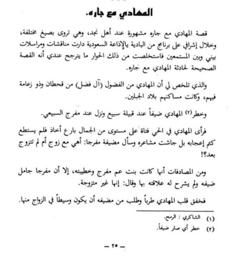 السعودية دارت مناقشات ومراسلات بيني وبين المستمعين فاستخلصت من ذلك الحوار ما يترجح عندي أنه القصة الصحيحة لحادثة المهادي مع جاره وذكر المؤرخ السويداء في كتابه النكهة الطائية ما نقله المؤرخ عيد المدعج السبيعي عن معمر يبلغ من العمر مائة سنة من قبيلة سبيع لا يزال على قيد الحياة
