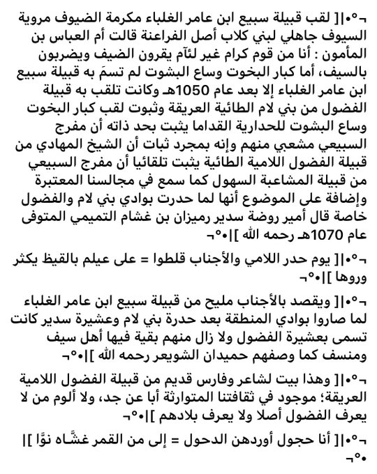 ¬°•|[ ويقصد بالأجناب مليح من قبيلة سبيع ابن عامر الغلباء لما صاروا بوادي المنطقة بعد حدرة بني لام وعشيرة سدير كانت تسمى بعشيرة الفضول ولا زال منهم بقية فيها أهل سيف ومنسف كما وصفهم حميدان الشويعر ]|•°¬