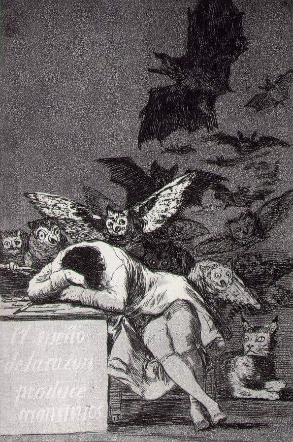 ﻭﻋﻠﻰ ﻣﻘﺪّﻡ ﺍﻟﻄﺎﻭﻟﺔ ﺍﻟﺘﻲ ينام عليها ﺍﻟﺮﺟﻞ ُ كتبت عبارة : " ﺇﺫﺍ ﻧﺎﻡ العقل ﺍﺳﺘﻴﻘﻈﺖ ﺍﻟﻮﺣﻮﺵ ." ﻫﺬﻩ ﺍﻟﻠﻮﺣﺔ اعتبرت ترجمة بسيطة ومباشرة لأفكار غويا الذي كان ﻳﺤﺘﺮﻡ ﺍﻟﻌﻘﻞ ﻭﻳﺪﻋﻮ ﺇﻟﻰ ﻧﺒﺬ ﺍﻟﺠﻬﻞ ﻭﺍﻟﺨﺮﺍﻓﺔ ..