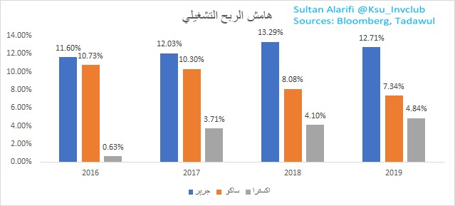ونلاحظ على سبيل المثال تحسن هامش الربح التشغيلي لدى اكسترا حيث في 2016 كانت الاقل من بين مجموعة الشركات العالمية ولكن سنة بعد سنة ارتفع هامش اكسترا التشغيلي من-0.6% الى 4% في 2019 متفوقا على المجموعة
