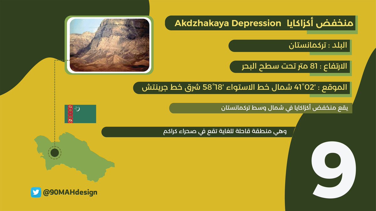 يقع منخفض أكزاكايا في دولة #تركمانستان احدى دول آسيا الوسطى الى الشرق من بحر قزوين اكبر البحار المغلقة في العالم وينخفض بمقدار 81 متر تحت سطح البحر ويعتبر تاسع أخفض نقطة على سطح الارض