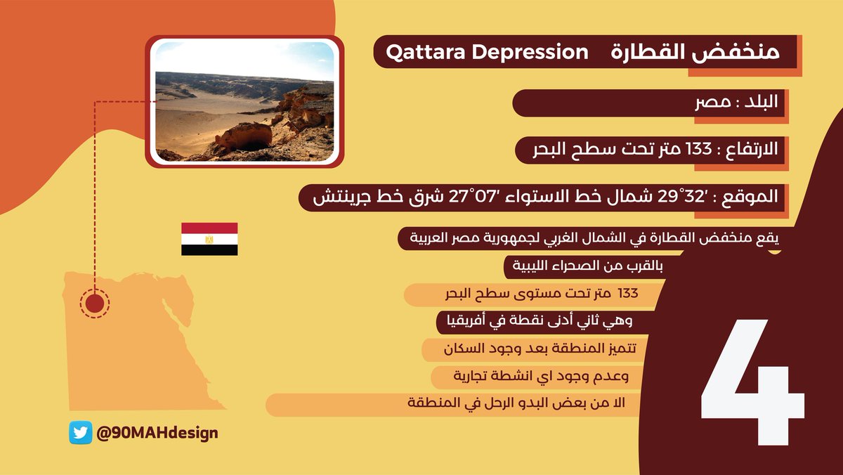 يقع منخفض #القطارة على مساحة شاسعة تبلغ 7500 ميل مربع الى الغرب من #جمهورية_مصر_العربية على الحدود مع #ليبيا في المنطقه التي انتصر فيها الحلفاء على الدبابات الالمانية في الحرب العالمية الثانية
