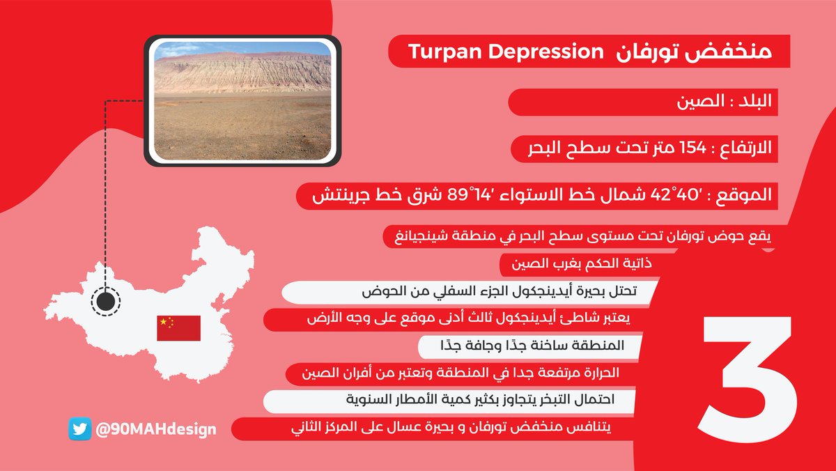يقع منخفض تورفان او بحيرة ضوء القمر كما يعرف بلغة #الإيغور المسلمين في اقصى غرب #الصين منطقة شينغيانغ او ماكانت تعرف بتركستان الشرقية قبل الاحتلال الصيني على عمق 155 متر تحت مستوى سطح البحر مما جعله ثالث اخفض نقطة على سطح الارض