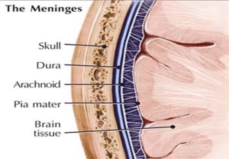 أولًا لازم نفهمه أن عندنا ٣ طبقات مهمة بين الجمجمة (💀) والمخ (🧠) ونسميها السحايا “meninges” لو تذكرون مرض اسمه التهاب السحايا meningitis صح ؟😉