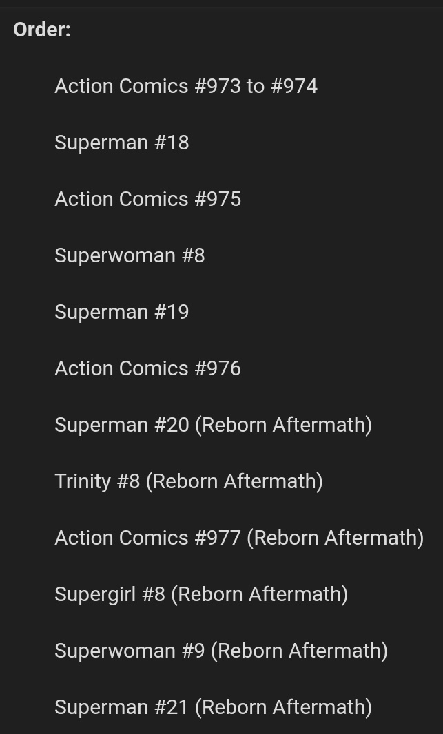 يجب ان تقرأ القصص بالترتيب بشكل حرفي بدون ترك اي قصة لان جميع القصص مترابطة على سلسلة قصصية Rebirth السنة الأولى ستنتهي بحدث Dark Nights Metals:Dark Knights آسف على الإطالة لكن كان لابد من الشرح المطوّل والآن نبدأ