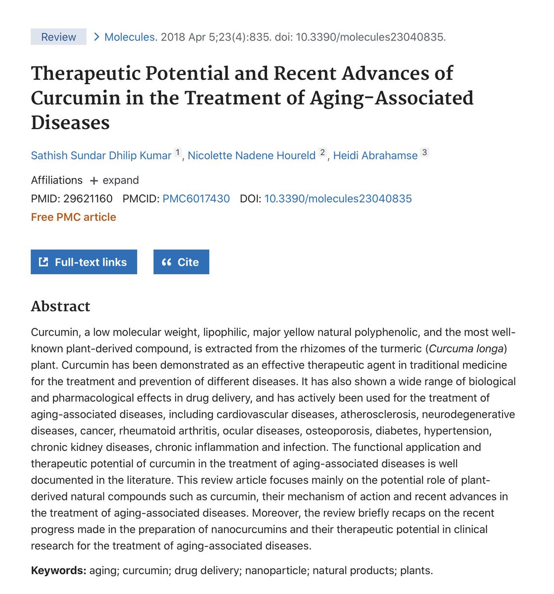 يحتوي الكركم على مادة الكركمين هو المركب الفعال الرئيسي، قد يبطئ الشيخوخة عن طريق تنشيط بعض البروتينات والحماية من تلف الخلايا.