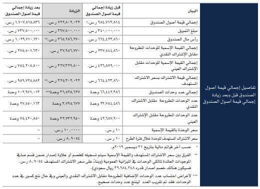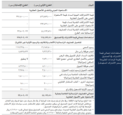 الصندوق يسعى للاستحواذ على 3 عقارات – برج أليجنس المكتبي و كليات الفارابي و مبنى تدريب مجاور لكليات الفارابي (تحت الإنشاء) و سيمول عن طريق التمويل البنكي و الاشتراكات النقدية و العينية في وحدات جديدة بسعر 8.9054 ريال