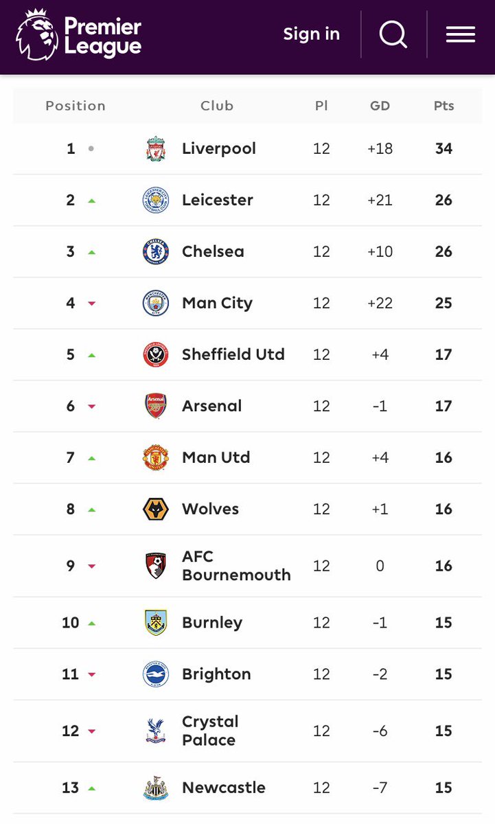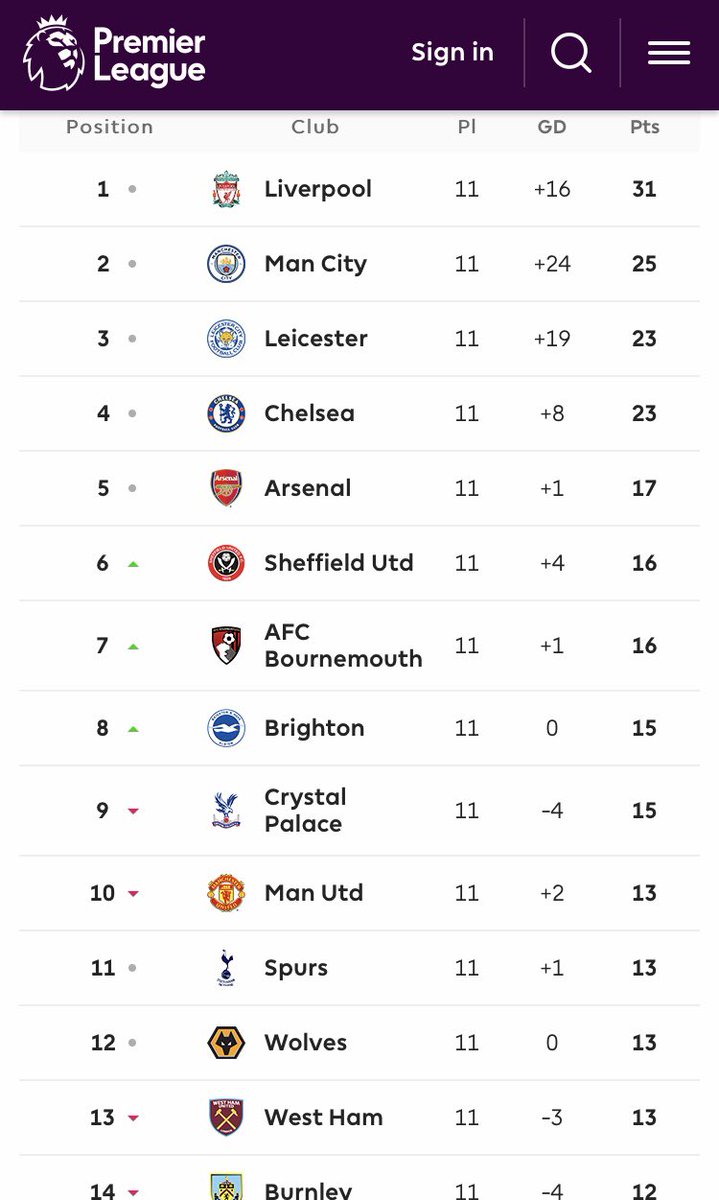 وصل رصيد ليفربول الي ٤٦ نقطة بفوز في ١٥ مباراة من ١٦ و يستمر فارق النقاط الي ٨ نقاط مع ليستر ويتسع الفارق مع السيتي الي ١٤ نقطة بعد خسارة امام مانشستر يونايتد ٢-١ في ملعب الاتحاد