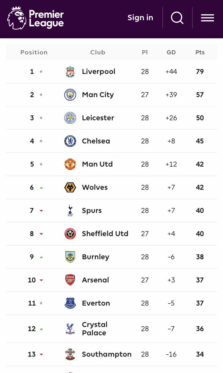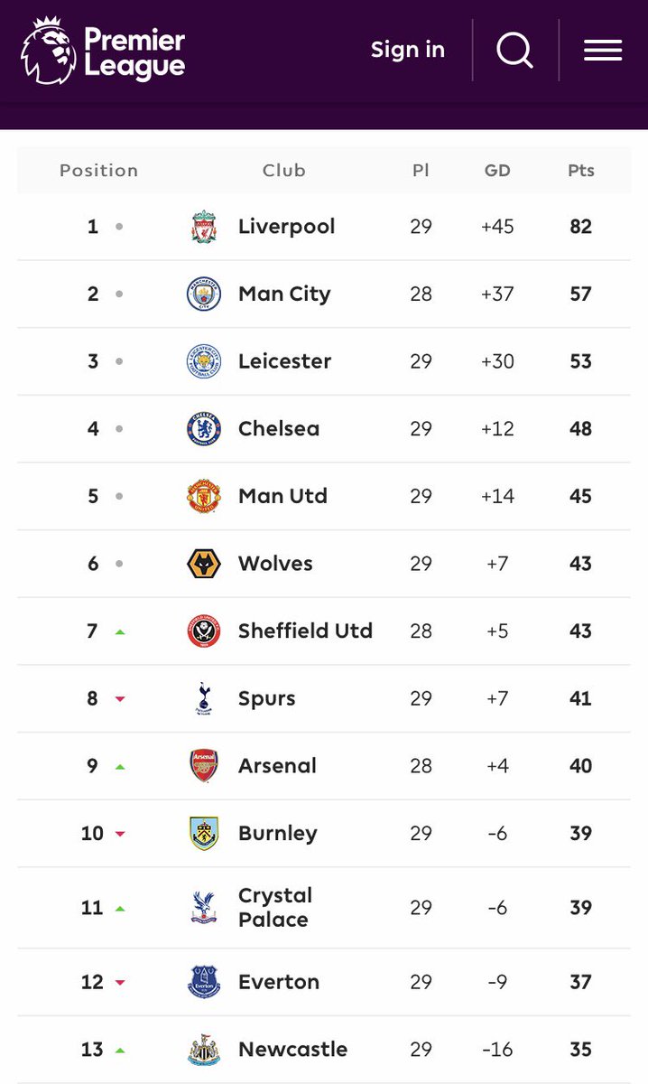 بقي الفارق مع السيتي ٢٢ نقطة حيث لم يلعب السيتي هذا الاسبوع بسبب لعبه مباراة نهائي كاس الرابطة و توقف رصيد ليفربول عند ٧٩ نقطة من ٢٨ مباراة. كمشجع ليفربولي يحلم بالفوز بالدوري اياً كان الطريقة الفوز بالدرع الذهبي شئ اضافي لكن الاهم هو الفوز بالدوري الغائب