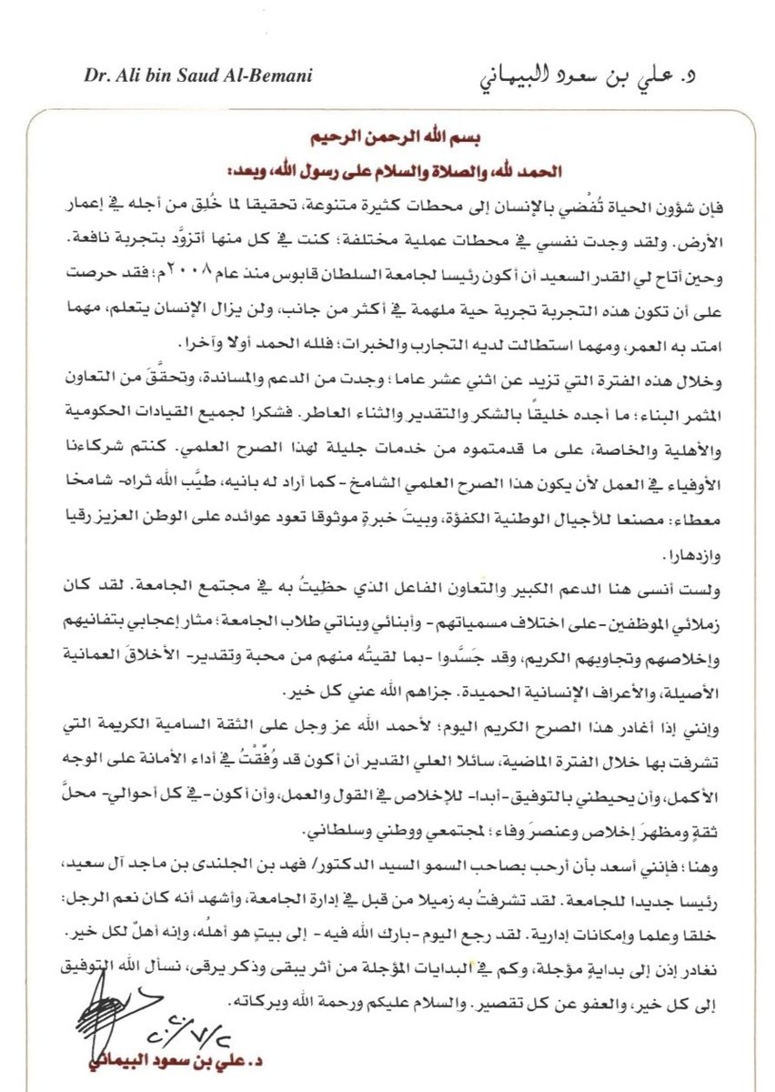 وهنا؛ فإنني أسعد بأن أرحب بسمو السيد الدكتور/ فهد بن الجلندى آل سعيد، رئيسا جديدا للجامعة. لقد تشرفتُ به زميلا من قبل في إدارة الجامعة، وأشهد أنه كان نعم الرجل: خُلقا وعلما وإمكانات إدارية. لقد رجع اليوم -بارك الله فيه- إلى بيتٍ هو أهلُه، وإنه أهلٌ لكل خير.