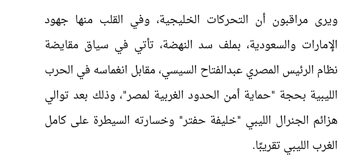 - الغريب ان السعودية و الامارات أكبر حليف لمصر ، في ايديهم بكل سهولة الضغط علي اثيوبيا من اجل تمرير شروط مصر و حماية ١٠٠ مليون مصري من الجفاف بل بالعكس الدولتين بيدعموا اثيوبيا اكتر ، لكن دي تسمى سياسة اللعب علي الحبلين