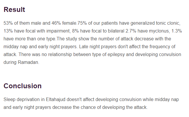 المرضى الذين التزموا بالراحة في منتصف اليوم ( القيلولة) و أدوا شعيرة التراويح أن نسبة حدوث التشنجات عندهم قليلة و نفس هذه المجموعة من المرضى عندما مارسوا نشاط قيام الليل لم يأثر على حدوث تشنجات .