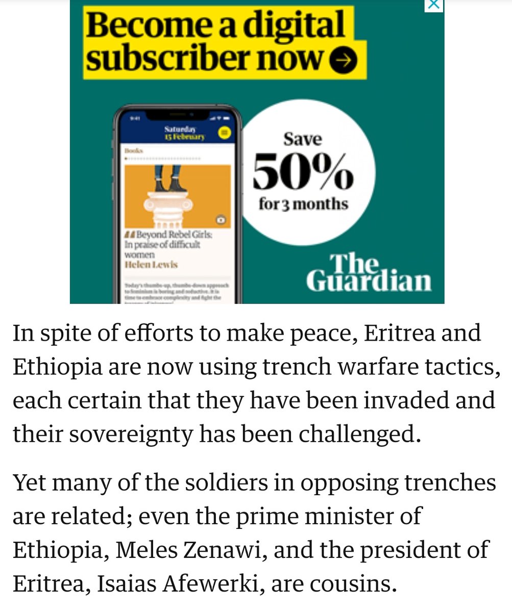 كثير من الأخوة من دول أخرى لا يعلمون بقوة الرابط بين الشعب الأثيوبي والأرتري. القصة اكبر من مجرد جيرة،#ارتريا في يوم ما كانت ضلع من ضلوع إثيوبيا لك ان تتخيل قوة الرابط بين الشعبين وبالأخص بشمال إثيوبيا (تصاهر، عشرة،حميمية،تقاليد).نفس الي بين شمال السودان وجنوبها.