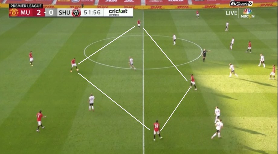 ▪️هكذا يصبح شكل فريق #مانشستر_يونايتد بشكل ' عمودي ' يتمركز الفريق ، يقوم اللاعبون ’ بإبتكار ’ #ماسة فيما بينهم لبناء الهجمة والصعود لمناطق أعلى .