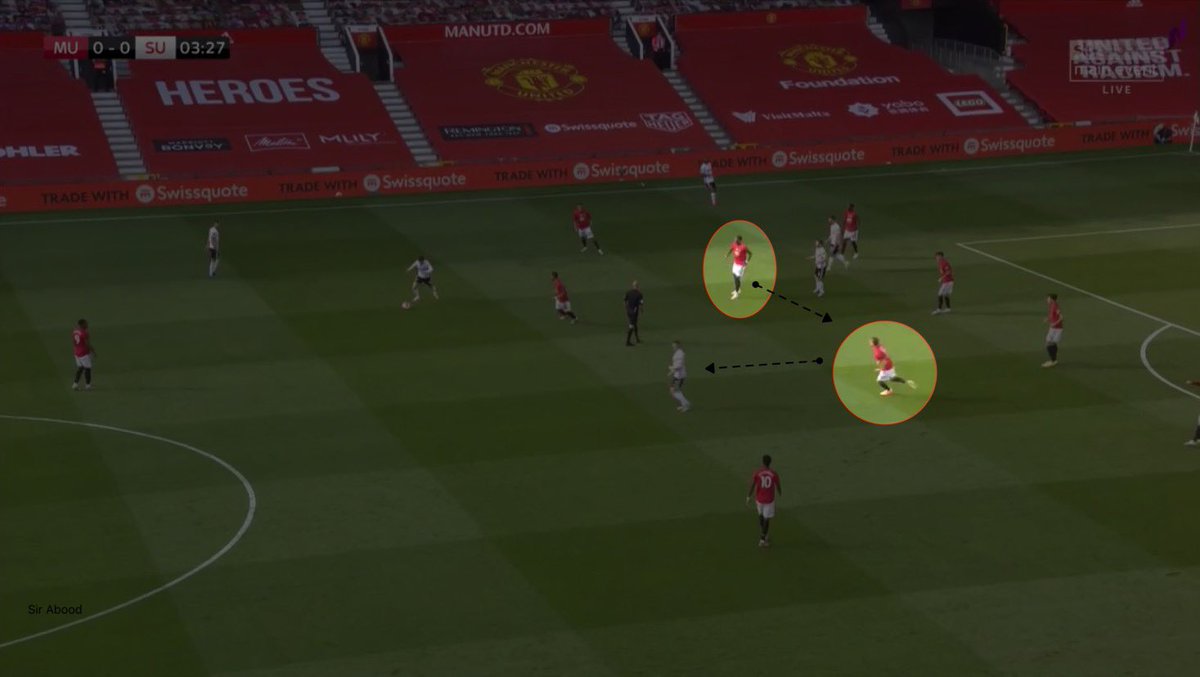 🔹 فكرة #سولشاير تتمحور حول سرعة التحول حين تكون الكرة بحوزة الفريق والخصم في ملعب #يونايتد، نلاحظ أن غرين يتحرك للداخل ليمرر 'لمارشيال' بالطرف بسهولة على الخط و يعطي برونو حل أفضل