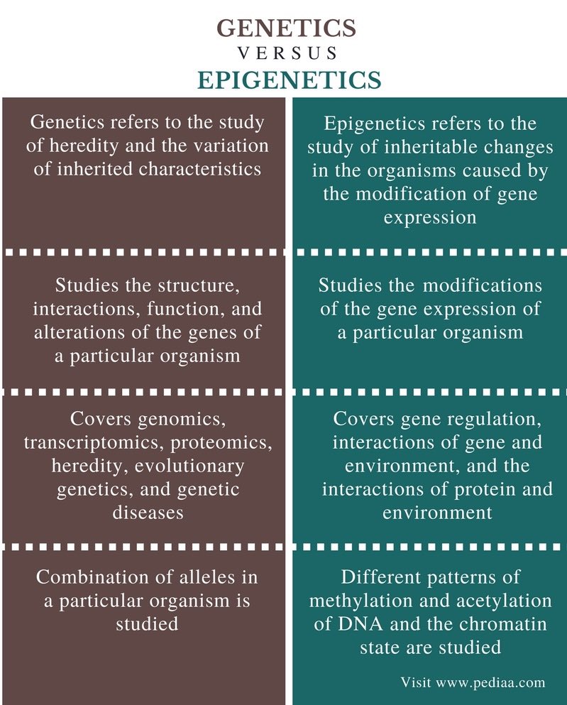 هناك نلاحظ الفرق بين العلم الجيني genetics والعلم مافوق الجيني epigenetics.