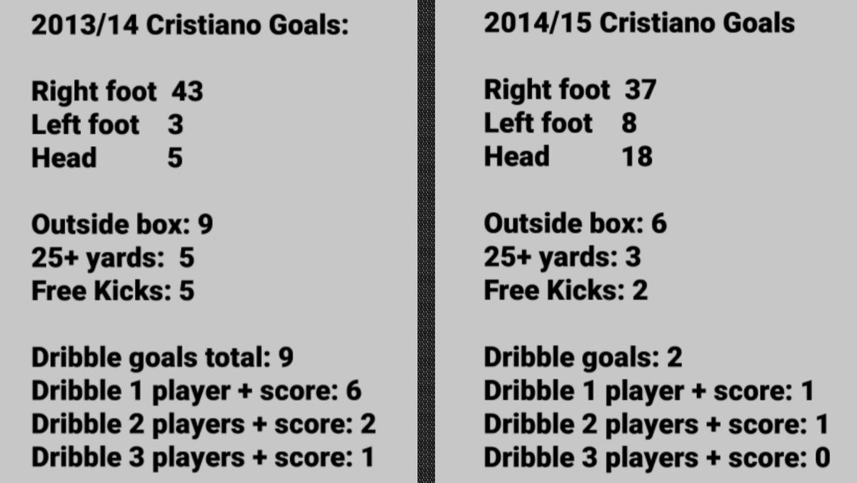 الآن الجزء الأحلى، كيف أثر ذلك في النهاية على أدائه؟ سنقوم بمقارنة أنواع الأهداف التي سجلها في موسمي 2013/14 و 2014/15.