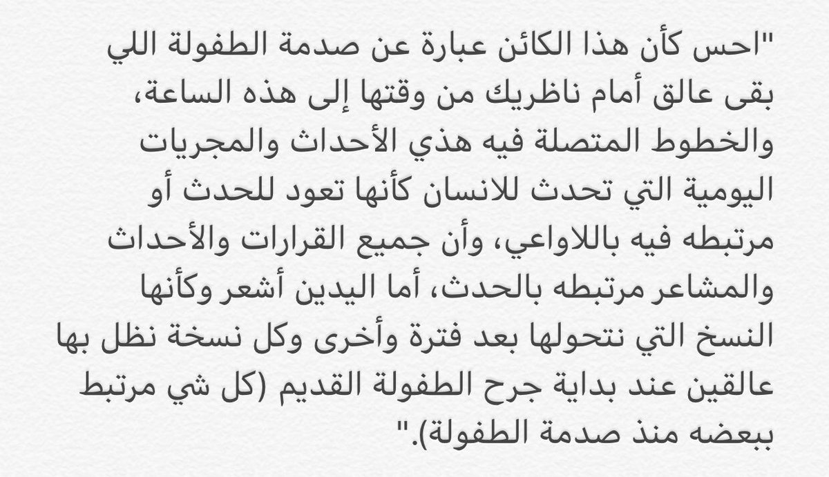 - "احس أنه مصدوم يوم شاف كمية الأفكار والمشاعر والاحاسيس اللي متحكمة فيه، كانه فمستنقع وخرج والحين يحاول يتخلص،هم المشوار صعب."