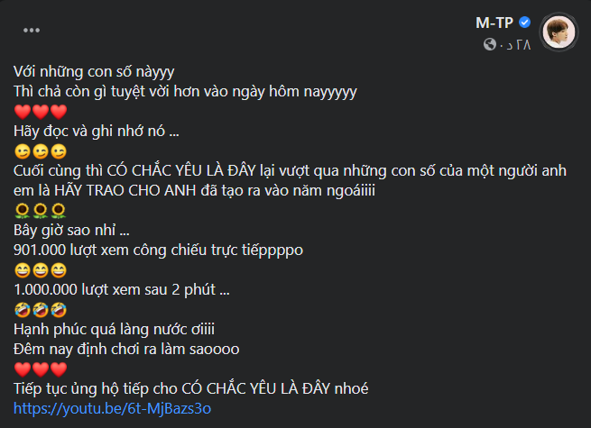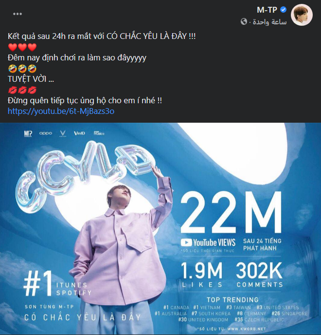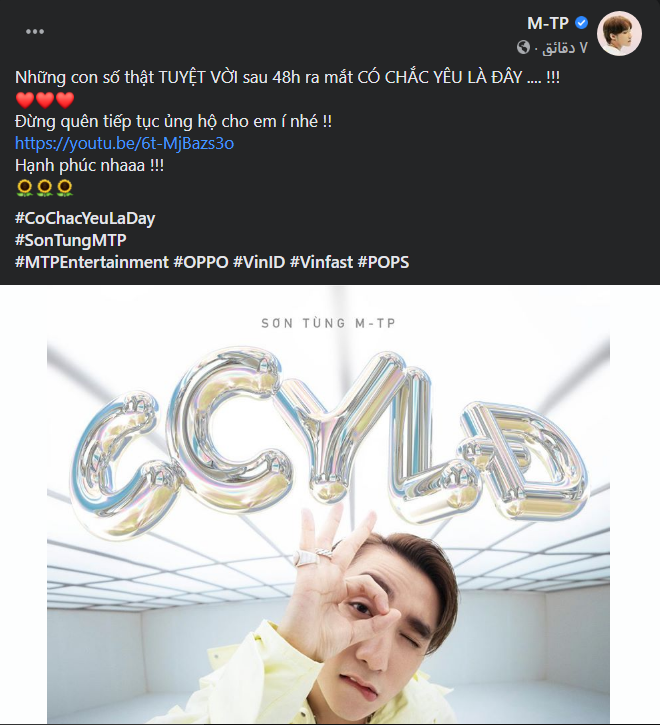 [update] يصل الفيديو الموسيقي #CoChacYeuLaDay الى أكثر من 9 مليون مشاهده خلال 5 ساعات من الاصدار , المشاهدات اكثر من ذلك لذا تظهر تدريجياً .